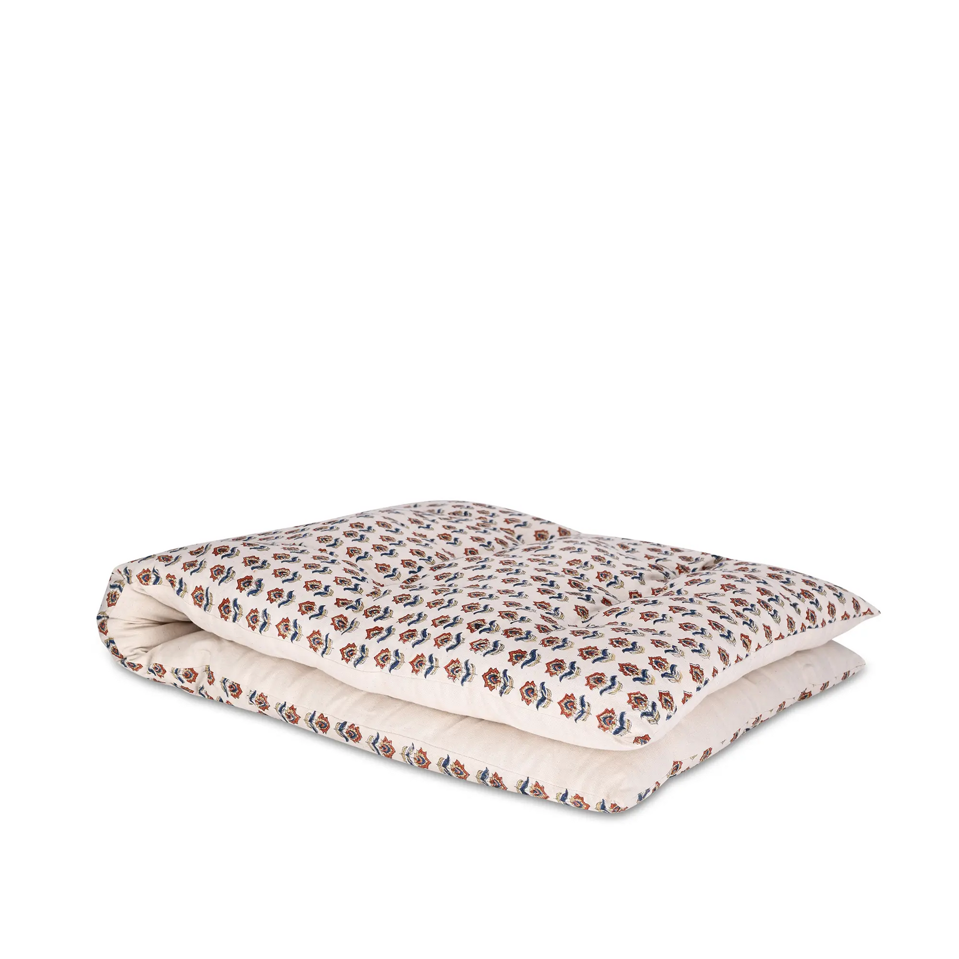מזרן רביצה מרווח ומפנק מבד 100% כותנה, עם נוכחות עיצובית של בלוק פרינט בעבודת יד.