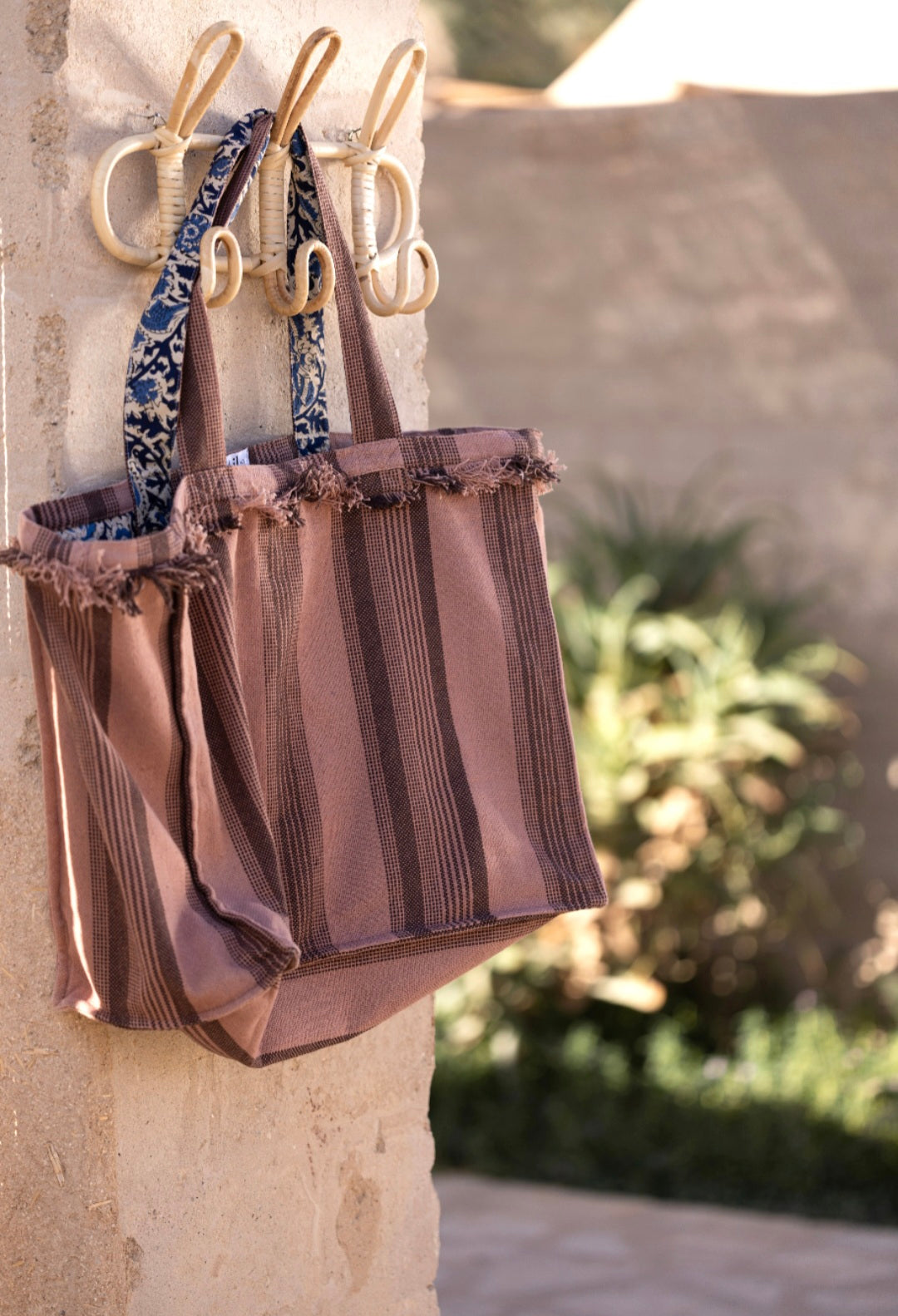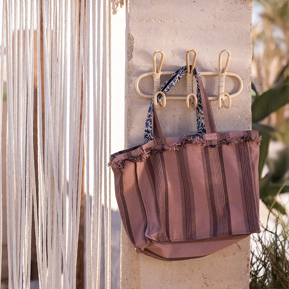 ​התיק מעוצב בדוגמת פסים ארוגים בגוונים חמים של ורוד אפרפר, המבטיחים עמידות צבע גבוהה לאורך זמן. שולי התיק העליונים מעוטרים בגימור פרנזים פרומים, המעניק מראה בוהמי ומעודכן.
