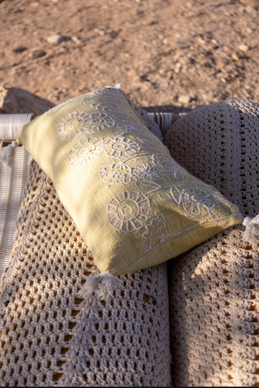 כרית נוי מלבנית זו היא יצירת אמנות רומנטית המשלבת קסם של מלאכת יד, רוך טבעי ואלגנטיות קלאסית להשלמת כל אווירה. הכרית מעוצבת על רקע בגוון צהוב-בננה בהיר ועדין, המעניק תחושת אור וחמימות לכל חלל. הלב הפועם של הכרית הוא רקמת הפרחים הלבנה והעדינה, היוצרת דוגמת שדה פרחים בוהמיינית וחלומית.