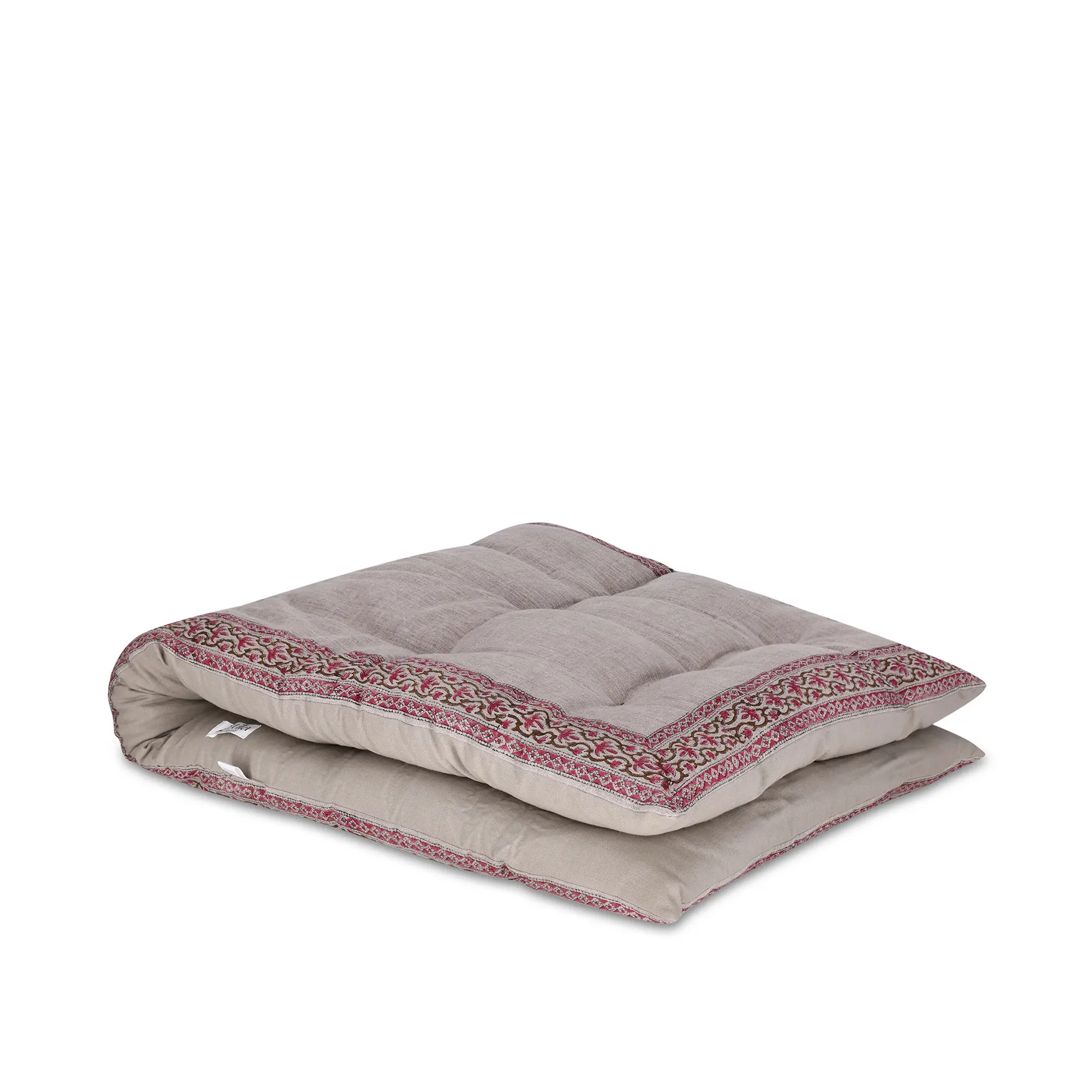 מזרן רביצה מרווח ומפנק מבד 100% כותנה, עם נוכחות עיצובית של בלוק פרינט בעבודת יד.